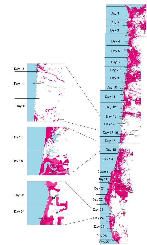 The trail is (currently) about 50% along the beach, 25% along trails and the rest along rural roads or highway. Maybe 25-35 miles are along the Oregon Coast Highway and there is at least one narrow tunnel (with little shoulder) we have to get through. Will probably end up hitching some of the highway.