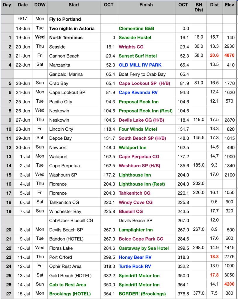 Our plan has us doing it the trail in 27 days (including two rest days). We will start on June 19 and finish (hopefully) on July 15. Of the 27 nights we will stay: