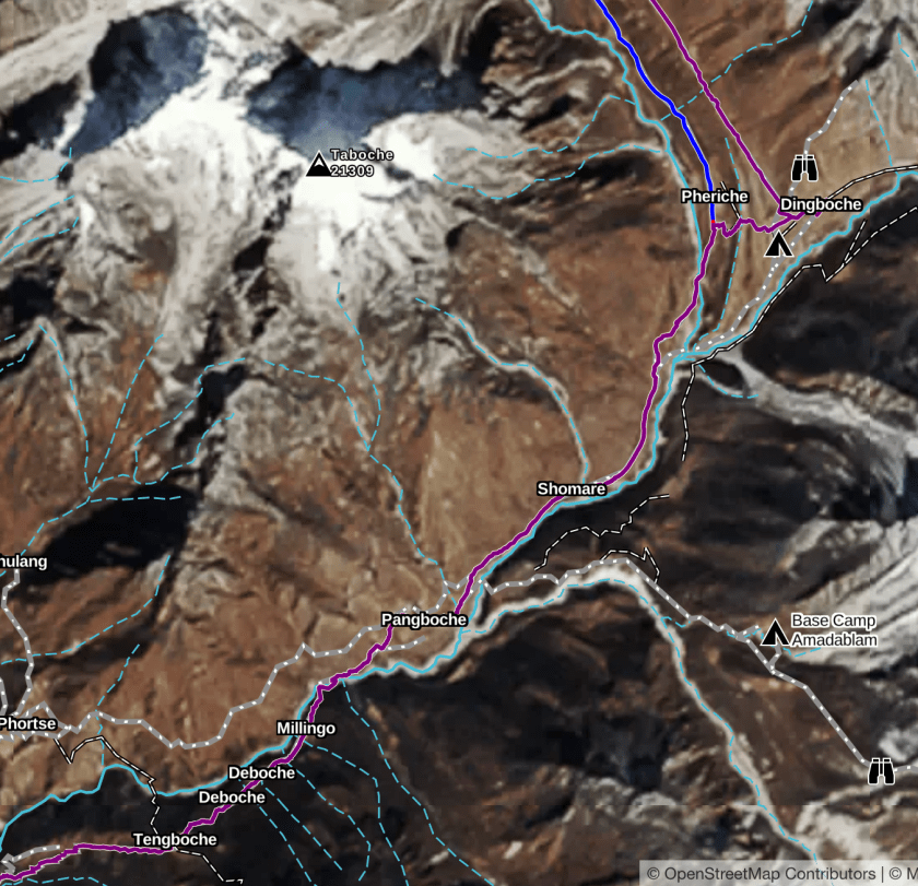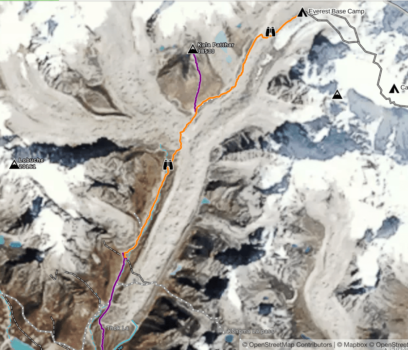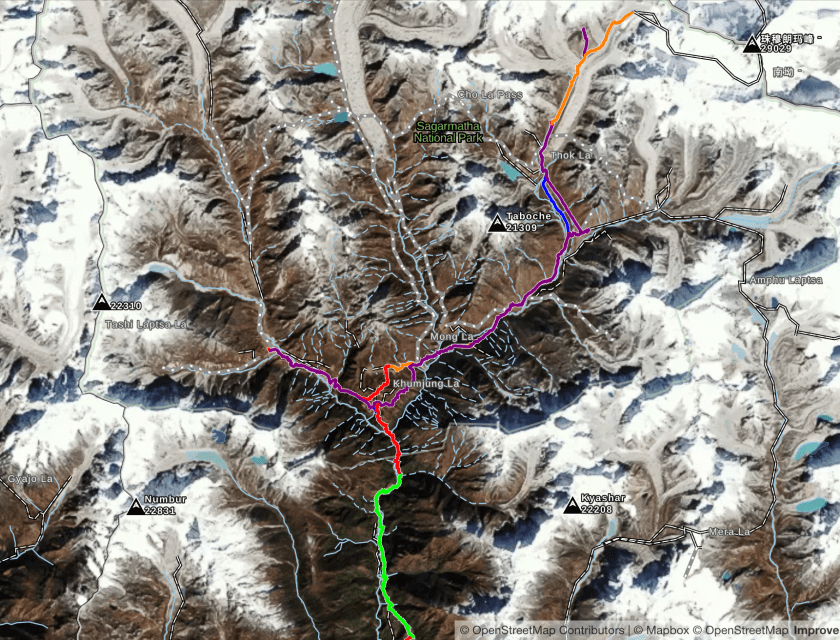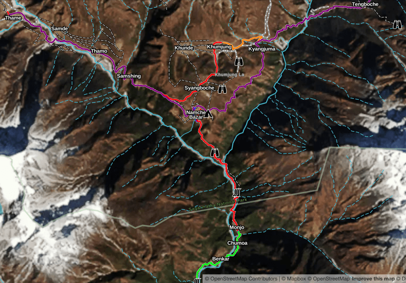 The trek with Alpine Ascents is billed as a 3 week trek but some of that is travel and acclimation. There are 14 actual hiking days and the route is a south-to-north out-and-back course that mostly follows river valleys. The northern terminus of the hike is Everest Base Camp (EBC) at 17,600′. The entire distance is less than 100 miles but there is a lot of elevation gain.
