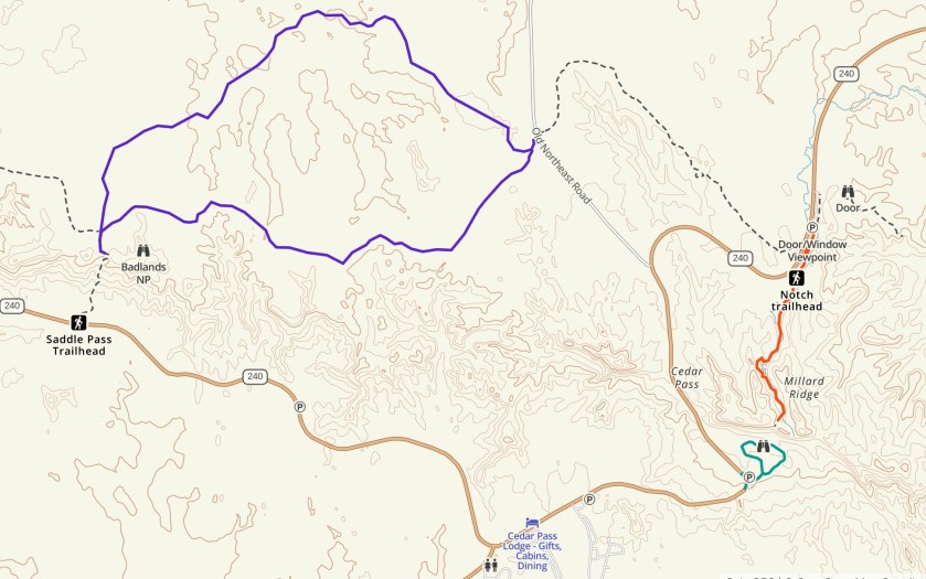 We did a loop, 2.5 miles out the Medicine Loop trail to Saddle Pass and then back along part of the Castle Trail.