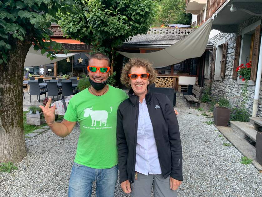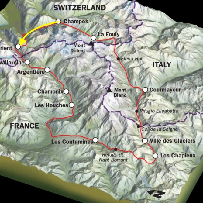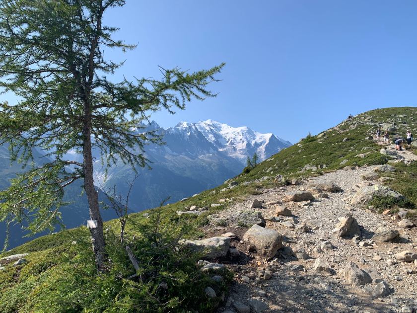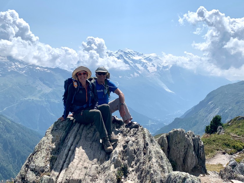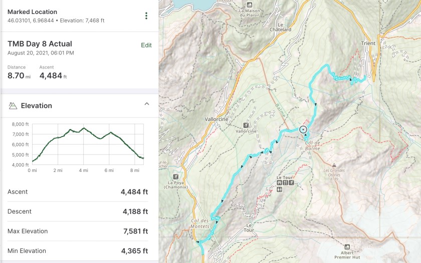 The complete TMB, walking every mile, is about 110 miles (though this can vary a bit because there are alternate routes). With our guiding company (MT Sobek) we are doing roughly 90 miles. Most of the difference is short road walks that we van around. But the MT Sobek itinerary eliminates one “stage” of the traditional TMB, from La Fouly to Champex, a roughly 10 mile stretch. We were told this day has only so-so views and no good views of Mt Blanc.