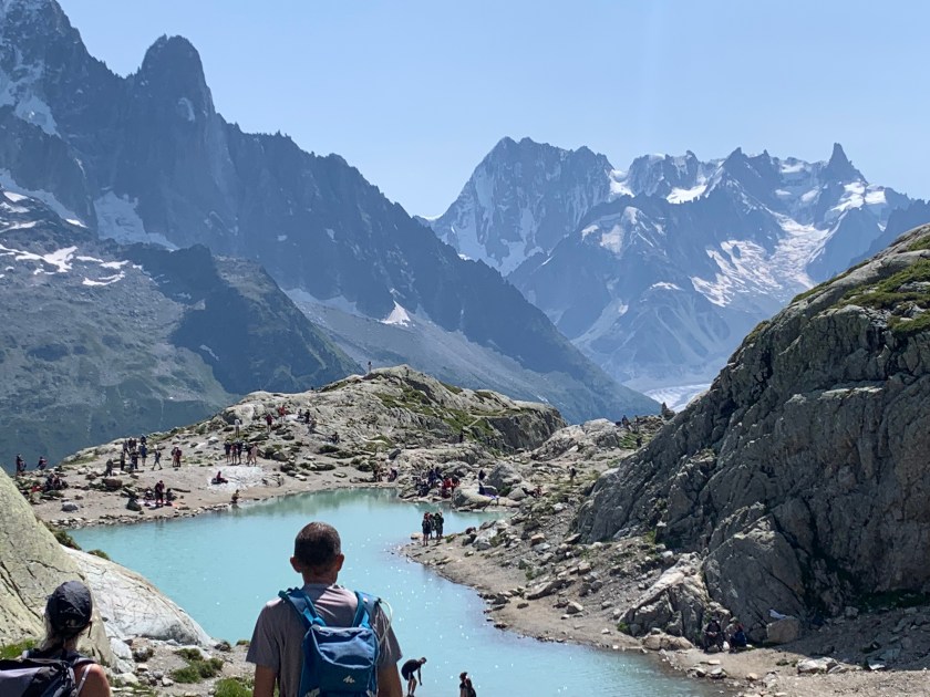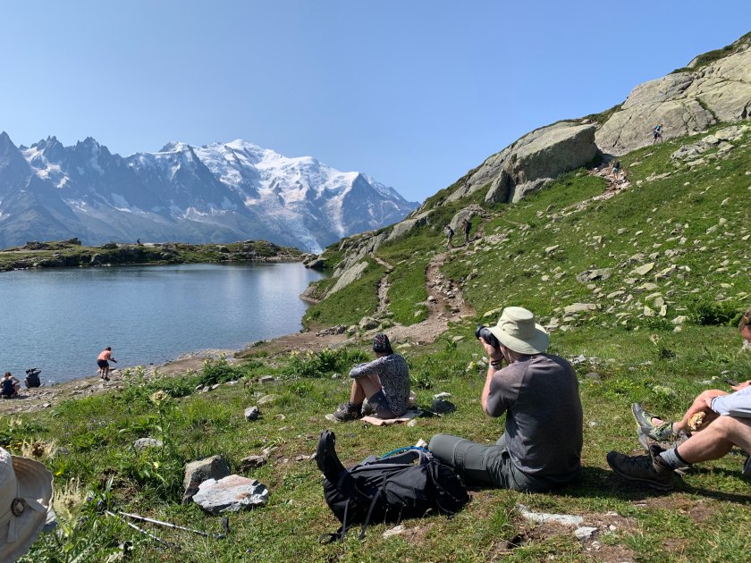 It was very pretty but… it being Saturday and close to Chamonix, was very crowded compared to the other days on the trail. We stopped at one of the first lakes for lunch to avoid the crowd.