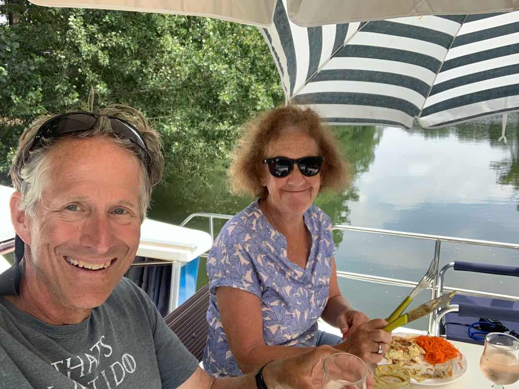 We often have dinner off the boat when we are in marinas since there is often little shade. We deploy our table and chairs and enjoy the shade.