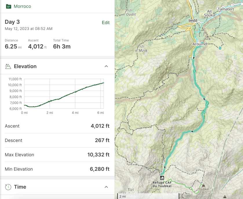 May 12, Arumd (6,600’) to Refuge du Toubkal (10,330’)