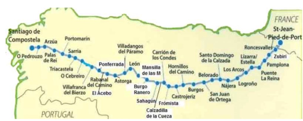 The Camino Frances (or “French Way“) is a particular route along the Camino de Santiago or “Way of Saint James,” a centuries old pilgrimage through Europe that ends in Santiago de Compostela. It is about 800 Km or just under 500 miles. It starts in southern France in the little town of Saint-Jean-Pied-de-Port, in the foothills of the Pyrenees.