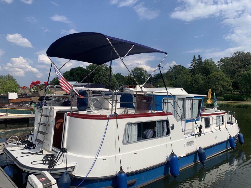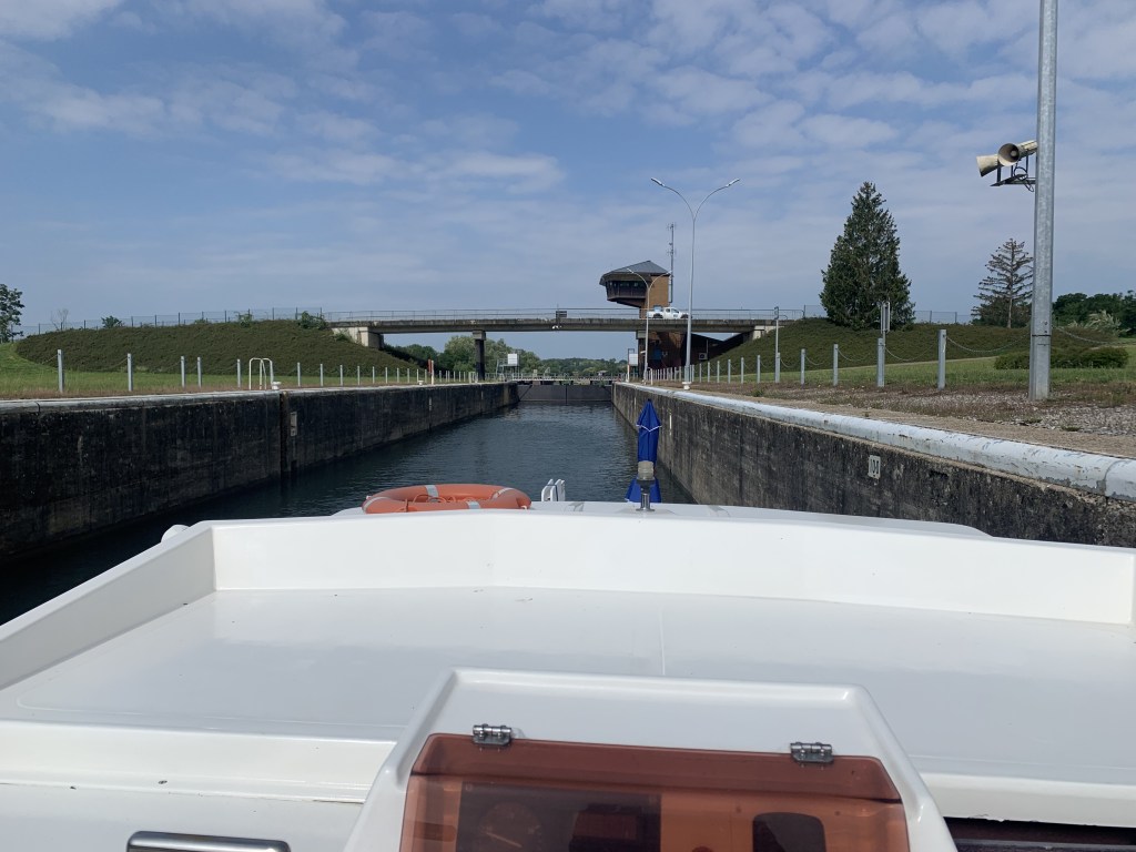 After dropping off our guests we headed back north on the Saône from SJL towards the Locaboat base in Scey-sur-Saône. Last summer, while cruising, we noticed a few Locaboat rentals with biminis so we contacted Locaboat. €2,010 seemed a bit steep but we knew it would fit and we desperately needed one so we ordered it. Now it was time to pick it up (after replacing the bow thruster control panel on the flybridge – yes, it is never ending)!