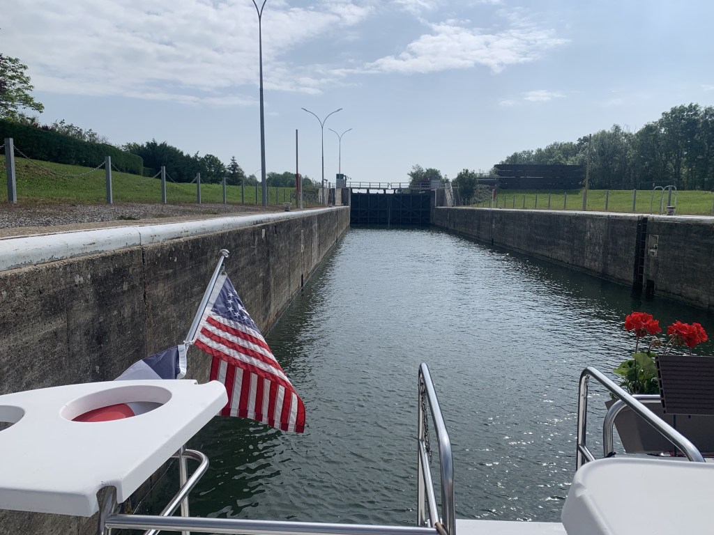 Another short day running the engine (and waiting for something to break…. this is a shakedown cruise after all) continuing south on the Saone. Everything seems to be working well. We had to pass through another of the big Saone locks.