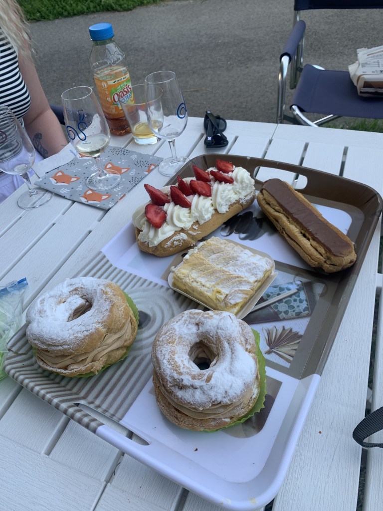 We found a bit of shade off the boat in Ranchot to celebrate Martini Night. And a boulangerie for a special dessert.