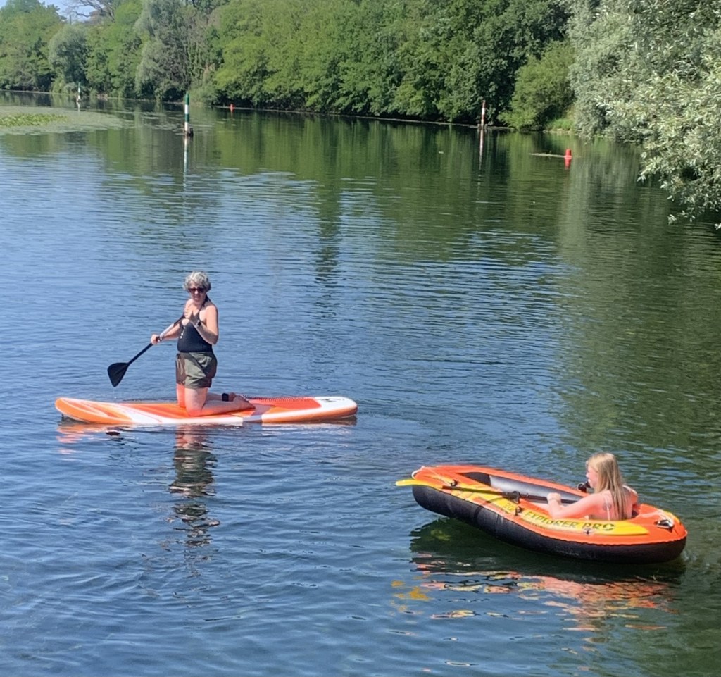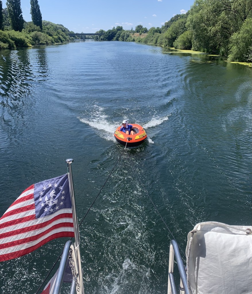 Leaving Besançon and heading north was new ground for us since Besançon was the farthest we had been on the Canal du Rhône au Rhin. This was a four-day cruise. It was still hot so we stopped a couple of times to play with our new boat toys… an inflatable dinghy and a paddleboard.