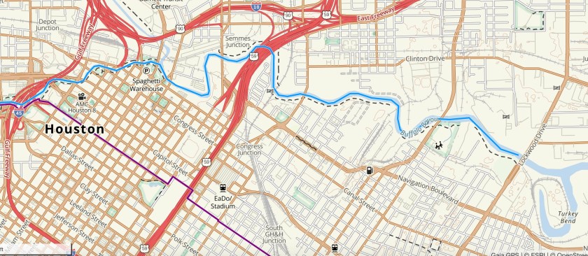 After kayaking a bit over six miles, paddling the whole way since there was almost no current, I pulled out at Reveille Park in Southeast Houston. From there I hike to the southern end of the Metro Purple line for the ride home.