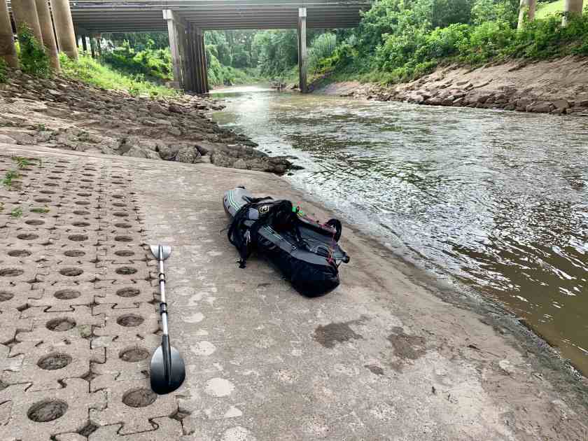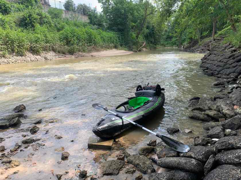 For my first test of my inflatable Kayak I hiked to Buffalo Bayou and the West Loop (610). Things got off to a rocky start when I slipped and fell in the mud trying to get the kayak into the water. My first lesson on kayaking Houston Bayous – access is often problematic.