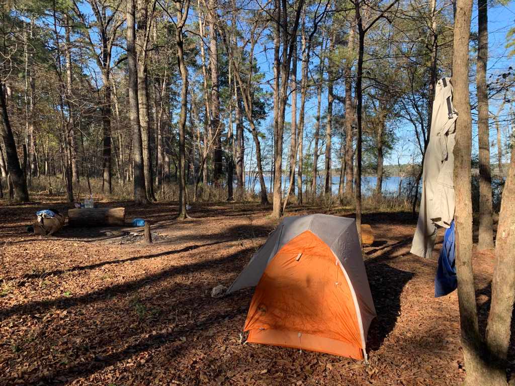 I camped at three of the designated primitive campsites on my hike. They were indeed primitive, consisting of a fire ring ,a couple of tent sites and, sometimes, a log to sit on. I’m not complaining, it’s nice having a cleared flat tent site but there is not much here. The other two nights I camped in Sam Houston State Park, which was both expensive and not that great, and a primitive campsite which was lovely. I stopped for breaks at Stubblefield and Double Lake CGs and would try to arrange a night at Double Lake when I do the LST again. It was such a lovely setting. My first camp was probably my favorite, a primitive camp on lake Conroe around LST mile 16.5.