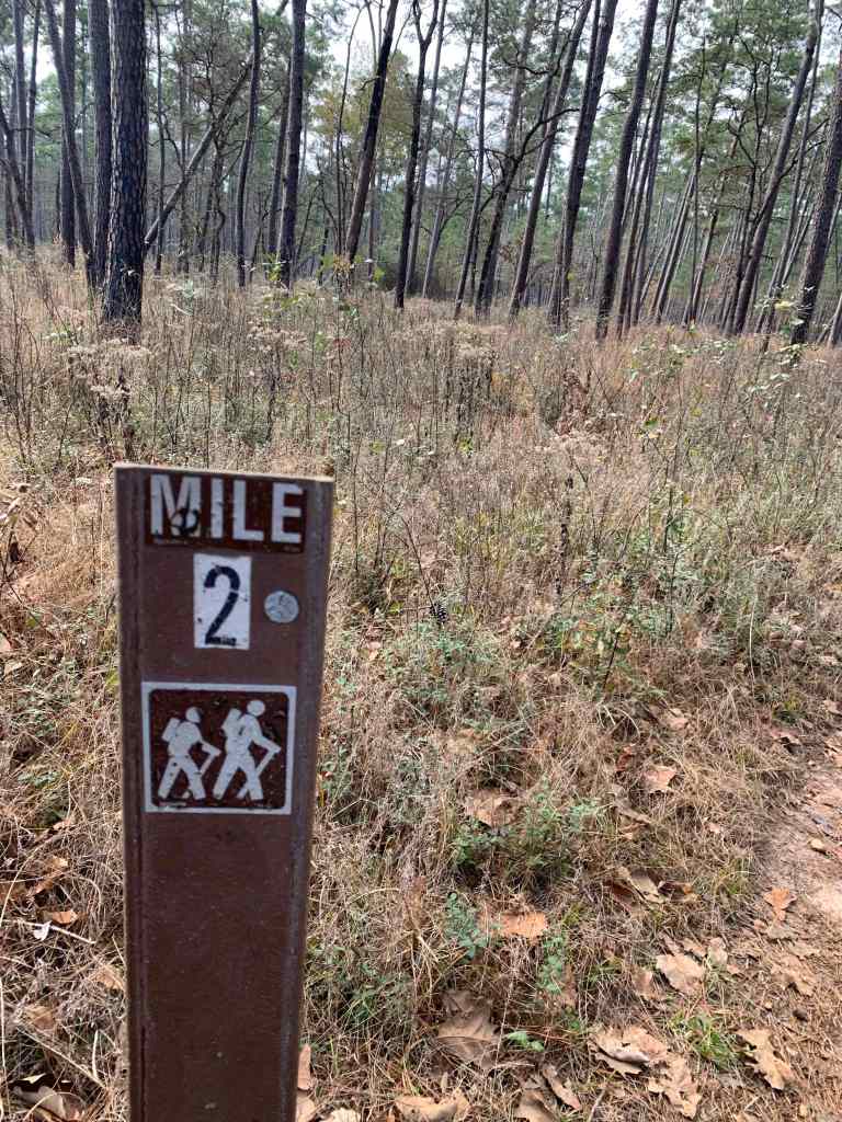 On the first day I passed three thru-hikers. I never saw these guys again. I also saw three or four day hikers near Lake Conroe. After that, over the next five days, I saw a grand total of one other hiker, a guy who was doing a west end yo-yo. Also I don’t think I saw a single car at any of the trailheads (which were very nice, by the way). I met a lone hunter near the end (in the swamp around mile 94). So, in four and and half days, after I left Huntsville State Park, I saw a total of two people.