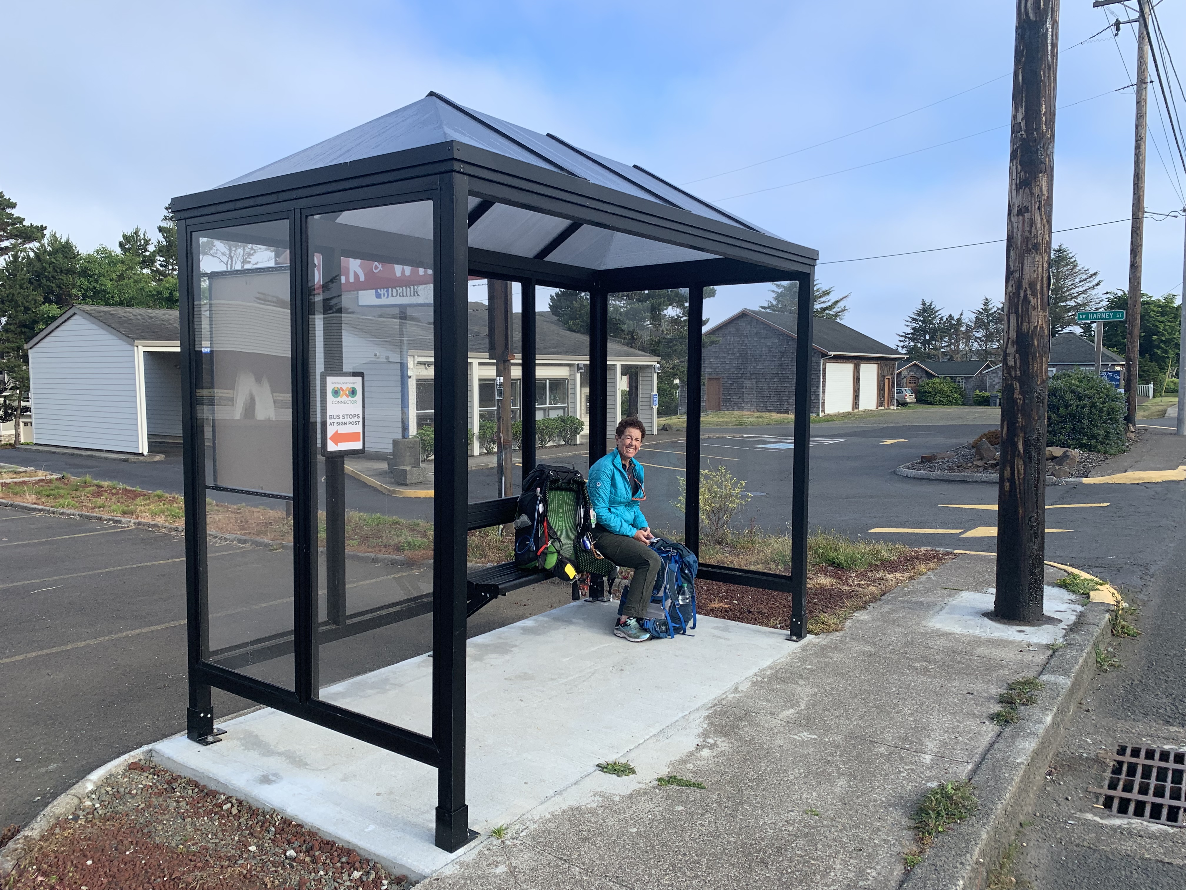 By this point we were starting to hate highway walking. Fortunately there is a bus you can grab heading south from Depoe Bay to eliminate a couple of highway miles (drop off at Rocky Creek Viewpoint) or ~ 4 miles (Otter Creek Viewpoint). The bus stop is in front of the Depot Bay Mall 101 and we caught it at 7:48 AM – Northwest Connector, North County Route. It made for a much more pleasant start to our day.