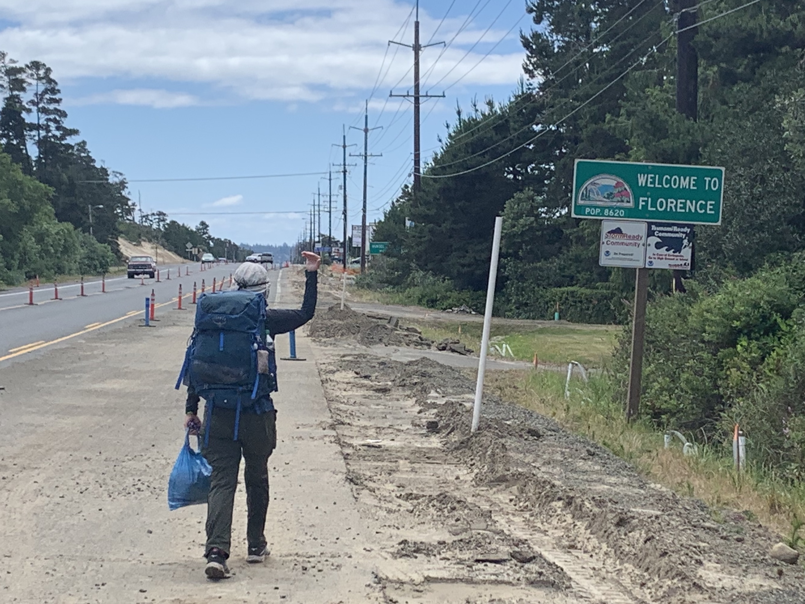 We needed supplies, so rather than follow the guide directions into Florence, we exited the beach near Heceta Beach Road which we took east all the way to 101 (about 2 miles north of Florence). Not a lot of shoulder but little traffic so not a bad walking road. There is a Fred Meyers just south of where the Beach Road hits 101. And the local bus (“Rhodi Express”) picks up at the Fred Meyers. For $1 each, we rode into Florence. Sweet! Even if you elect to hike into Florence (which you can do without using the highway) the bus can be used to get back to the Fred Meyers. We took our second rest day here and saw the July 4th fireworks over the river.