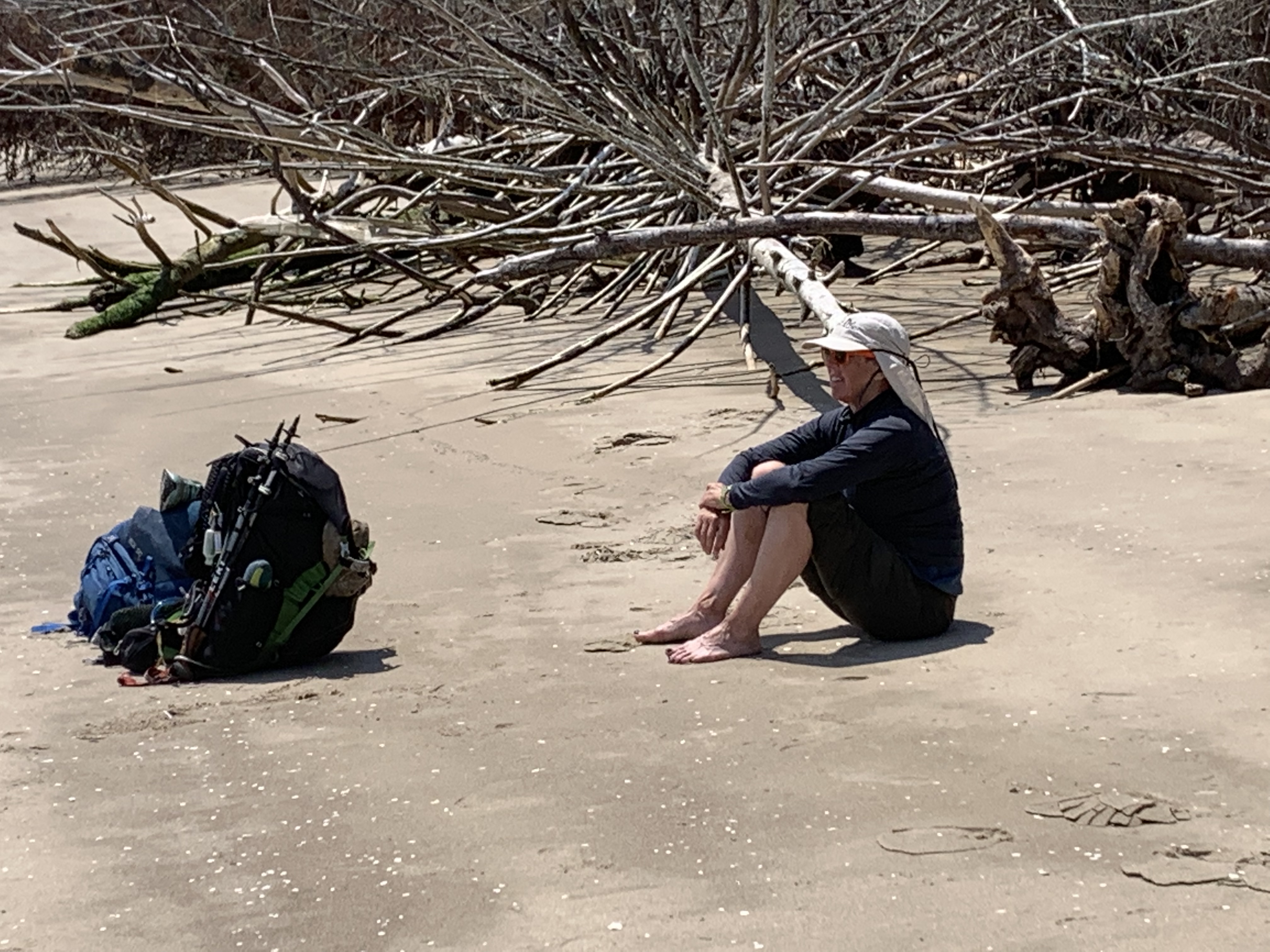 From the map I thought we might be able to cut across the spit but this is not possible. You have to hike to the end of the spit (where it meets the jetty) and then take a path that looks like an old jeep track back north along the river side of the spit to get to the sand beach where you can be picked up. You can not walk the jetty – it is too rough. Nobody said anything about tides but they really cannot pick up at low tide. We ended up waiting an hour or so for higher water to get picked up.