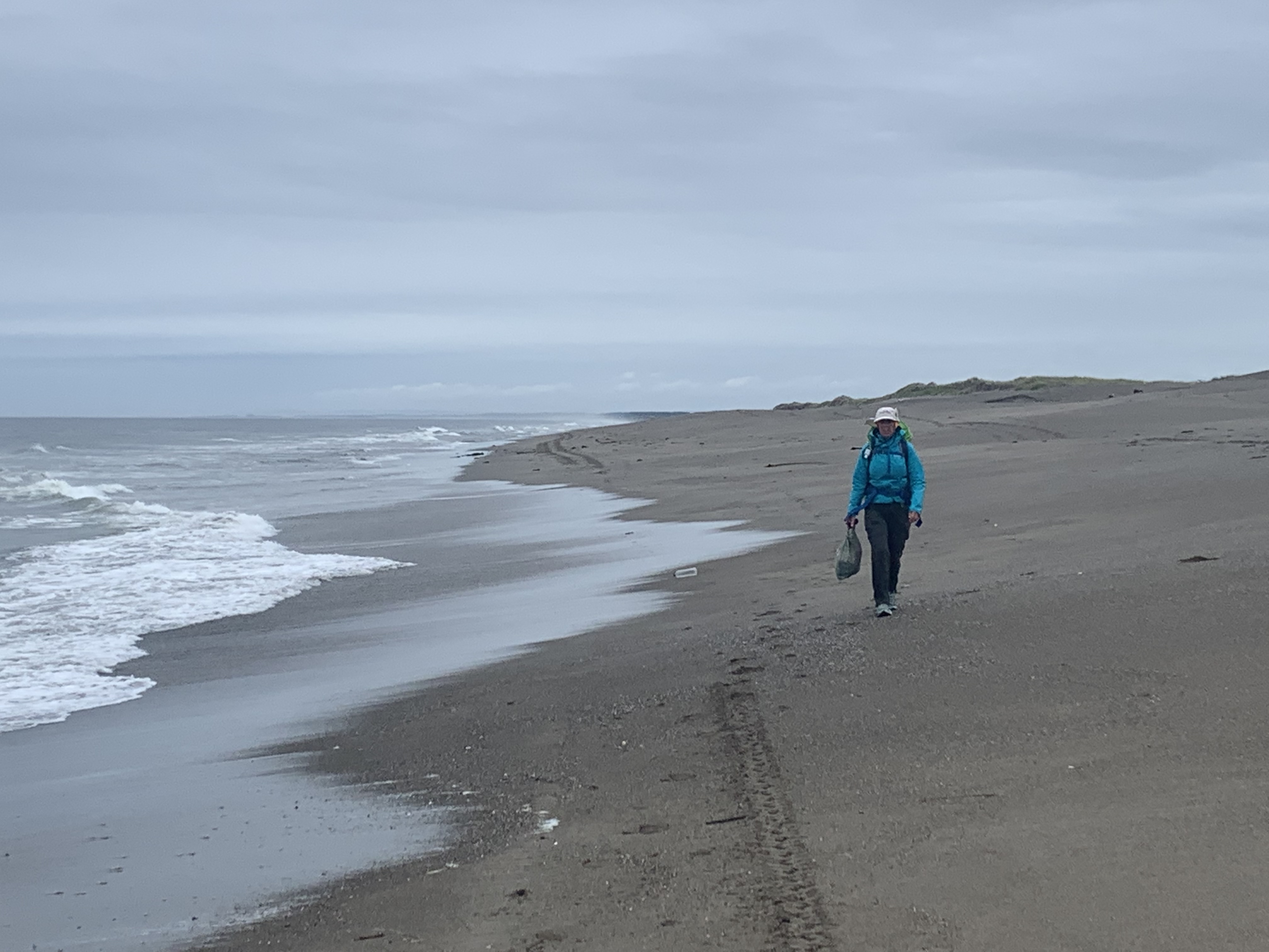 We stayed at Boyce Cope Camp Ground. We only saw two people on this part of the beach but one of them, a bird naturalist, told us we could get off the beach about a mile north of the campground. It was right past a Plover keep-out area and led to a packed earth trail just behind the dunes. It eliminated the last mile of tough sand walking.