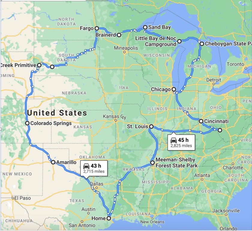 We finally gave up on the Houston summer heat and headed north in the middle of the pandemic. Our first stop will be a three week stay at an AirBnB in Colorado Springs to visit Francis and Emilie and do some hiking. I’ll be putting anything interesting in the way of hikes on this page. Below is the grand plan (updated). After Colorado we plan to do mostly camping until we hit Chicago.