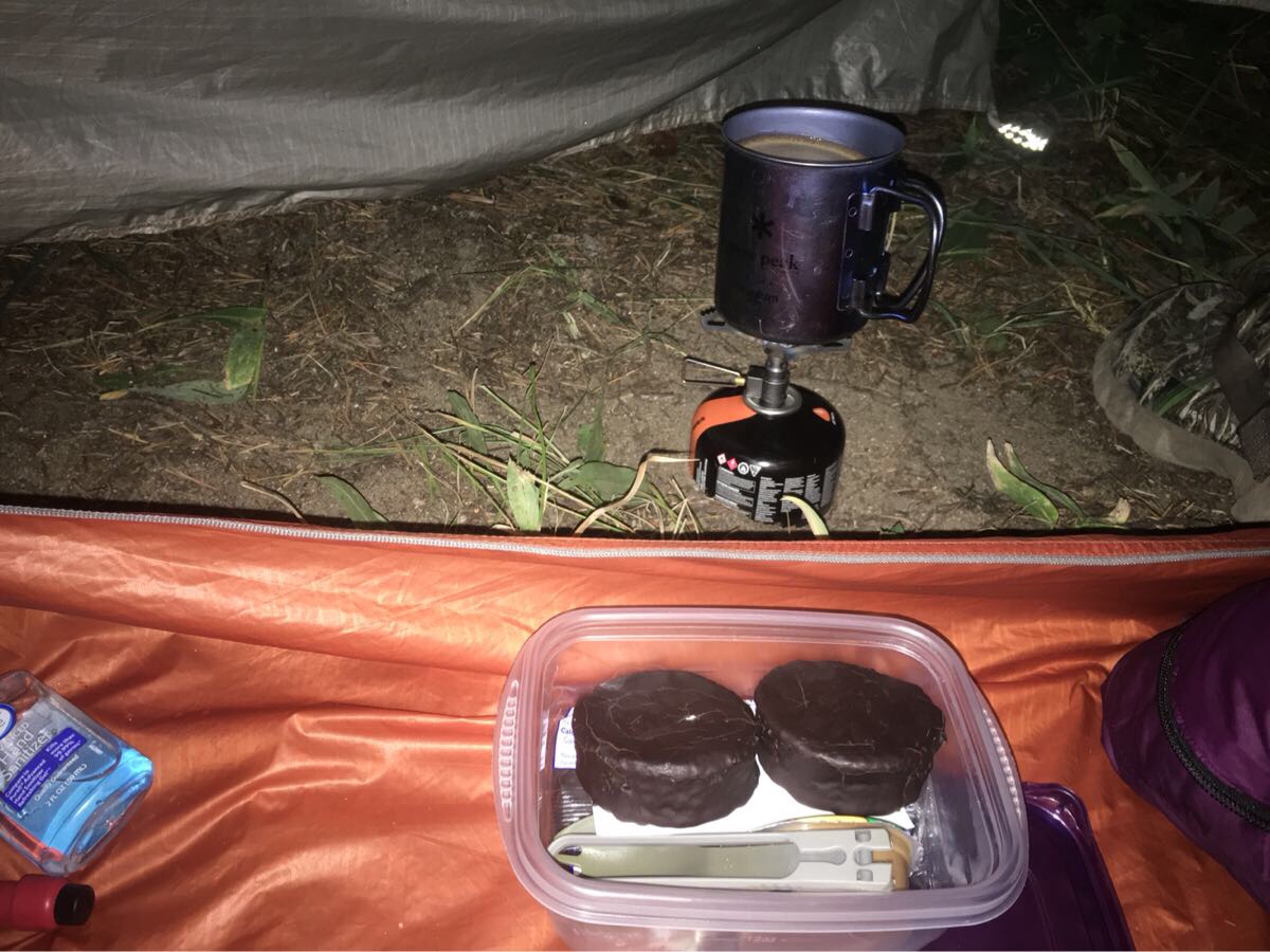 If I was doing my usual 16 miles or so I would hike straight to my planned camp site and have my afternoon snack there while putting up my tent. I usually tried to camp near a water source where I would scoop 4L of water into my dirty water bag, hang it on a tree and begin filtering water.