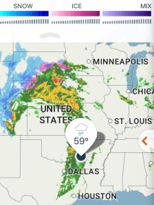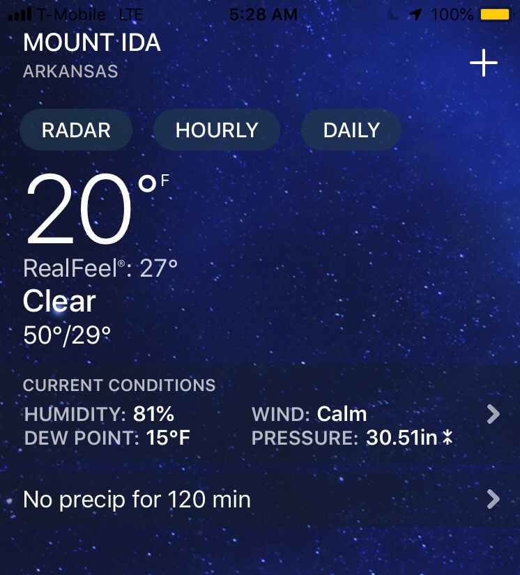 We arrived in Mt Ida early this afternoon after a cold, two day drive from Denver. Last night is was 15 degrees in Tulsa! Tomorrow promises to start cold (16-20 degrees depending on who’s forecast you trust) but should see the beginning of a warming trend that will bring temperatures back to a more normal range by Friday.