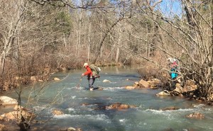 Fantastic weather all day. Trail was wet but significantly better than the other side of the lodge. First five miles followed the scenic byway before heading down to the Kiamichi River. Eight river crossings of the river. Eight! And we got wet on nearly every one.