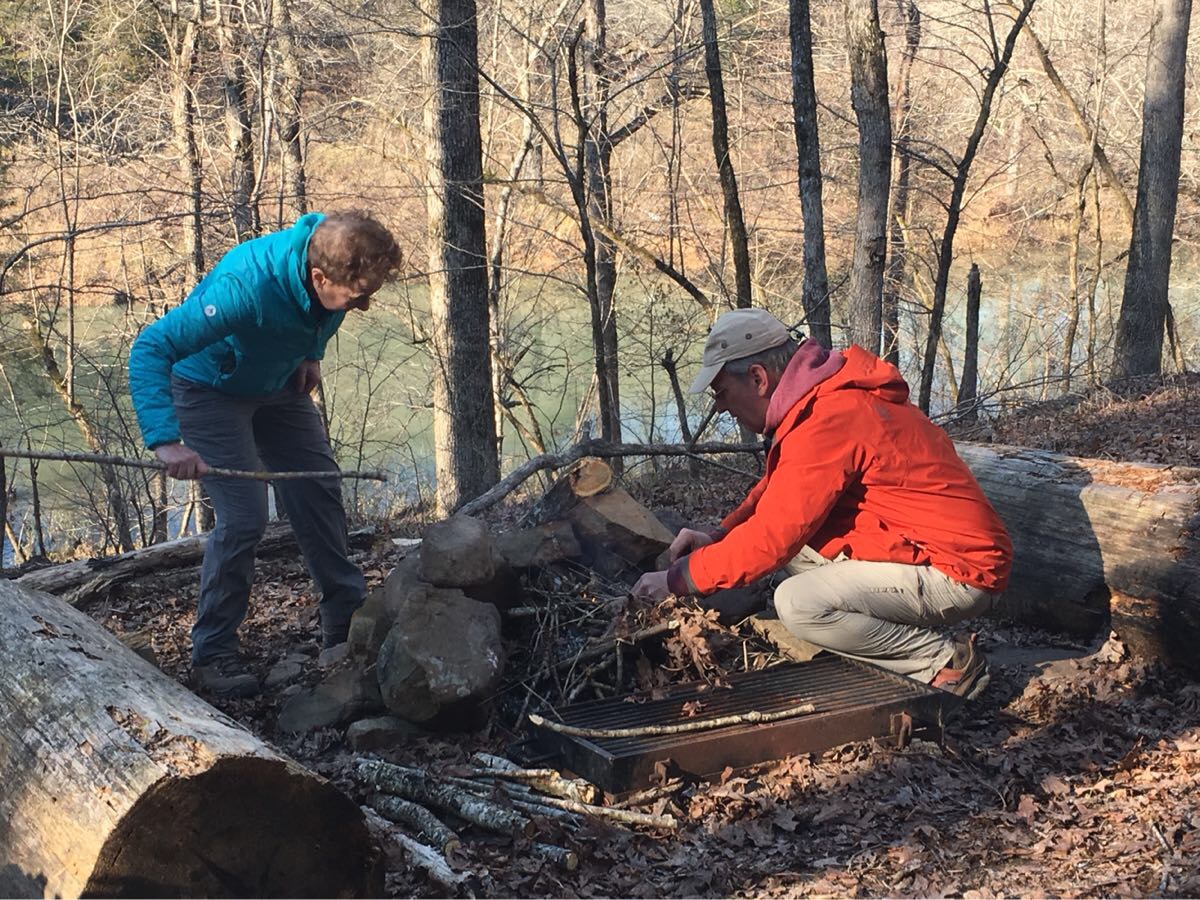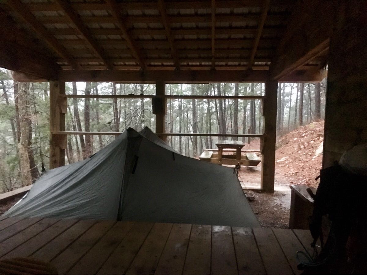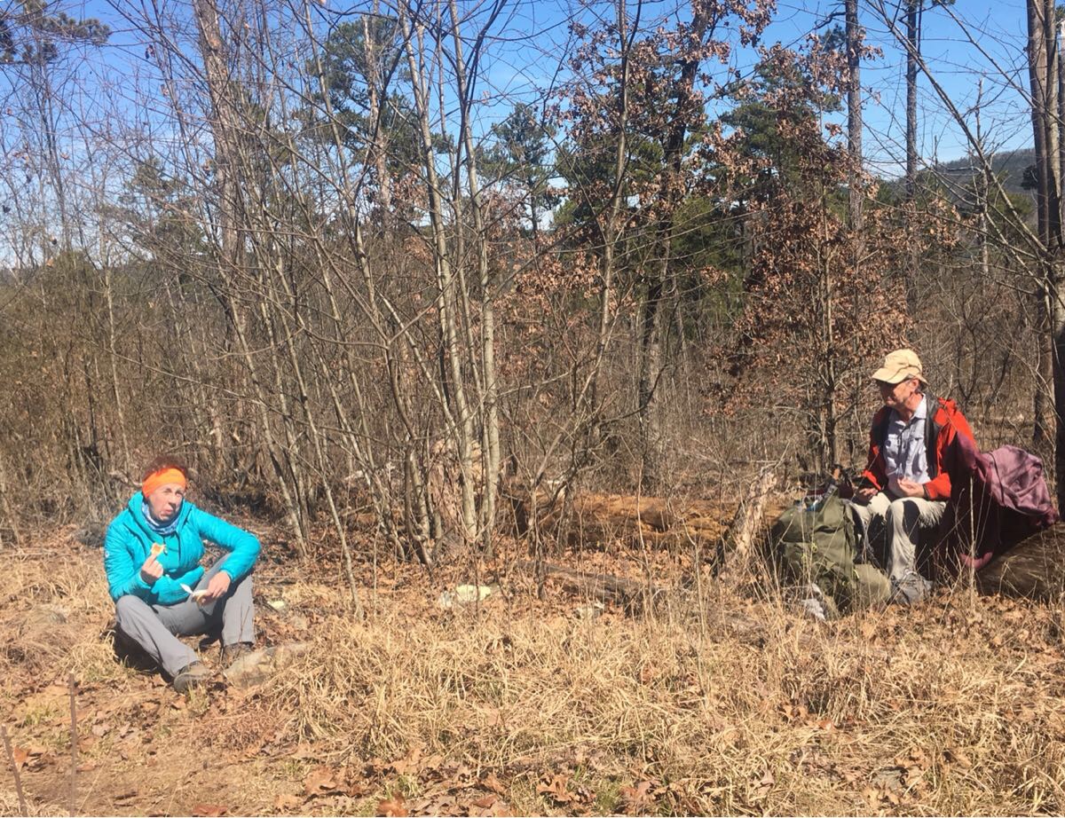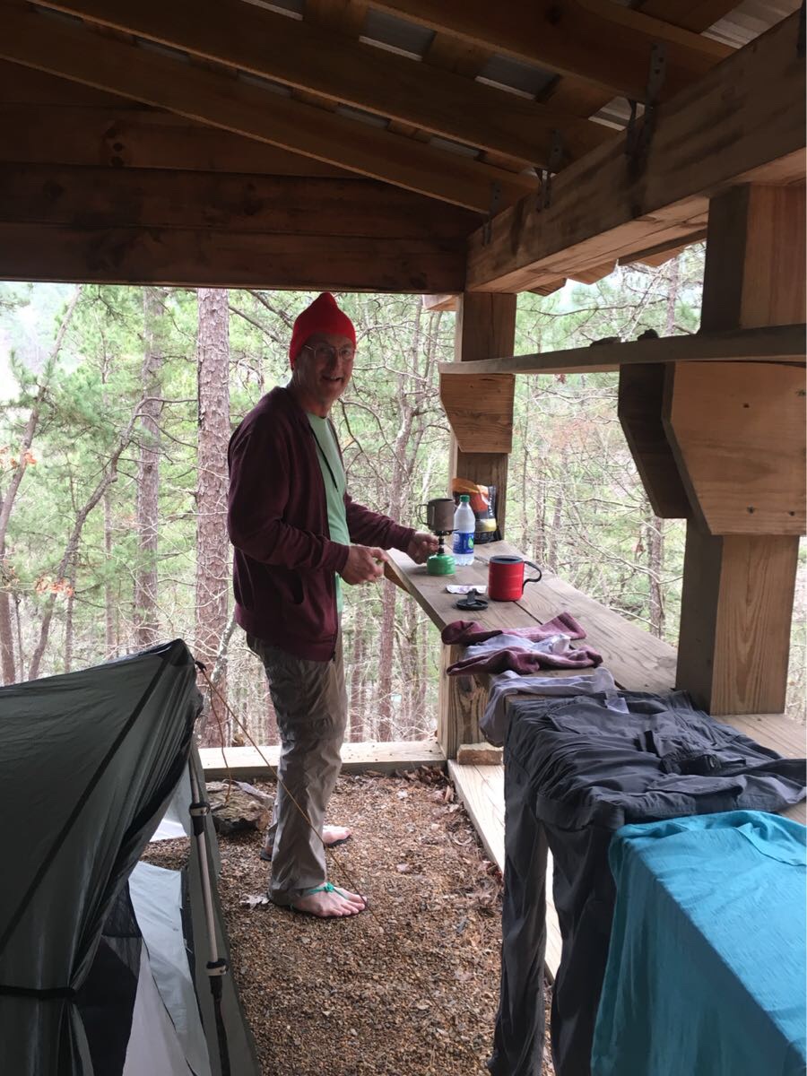 Woke up early at the Royal Oaks Inn (Mt Ida) and drove to the Blue Bell Cafe for breakfast and a ride to the trail from Lori (cafe owner). Cold (~20 degrees) but the sun is out and we had a wonderful first day of hiking in sunshine to our first camp at the Bill Potter Shelter after 11.4 miles.