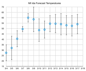 The projections show a 20 degree average temperature rise from Monday to Thursday. After that the temperatures are more typical (40-65) for this time of year. We will probably get some rain but, especially after last year, we don’t want any more sub-20 degree nights.