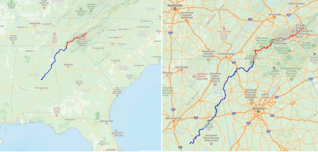 I will pass through three states: Alabama, Georgia, and Tennessee. This PT is a relatively new trail (it was officially opened in 2008). The BMT is slightly older (it opened in 2005). Approximately 6o miles of the PT is on paved roads (mostly in Georgia) so I may elect to hitch some that. The BMT is nearly all mountain trails.